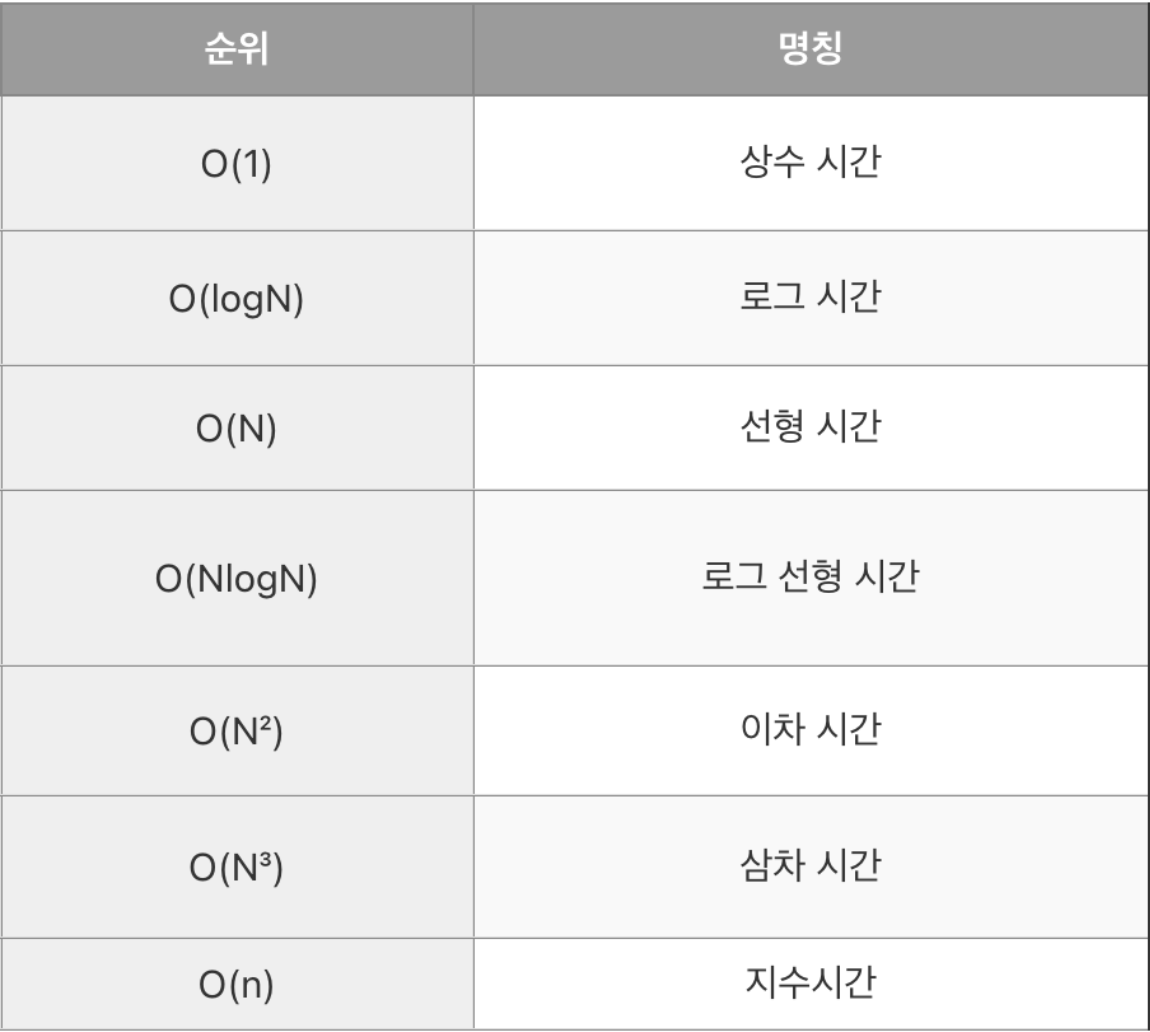 - 시간 복잡도 : 특정한 크기의 입력에 대하여 알고리즘의 수행 시간 분석
