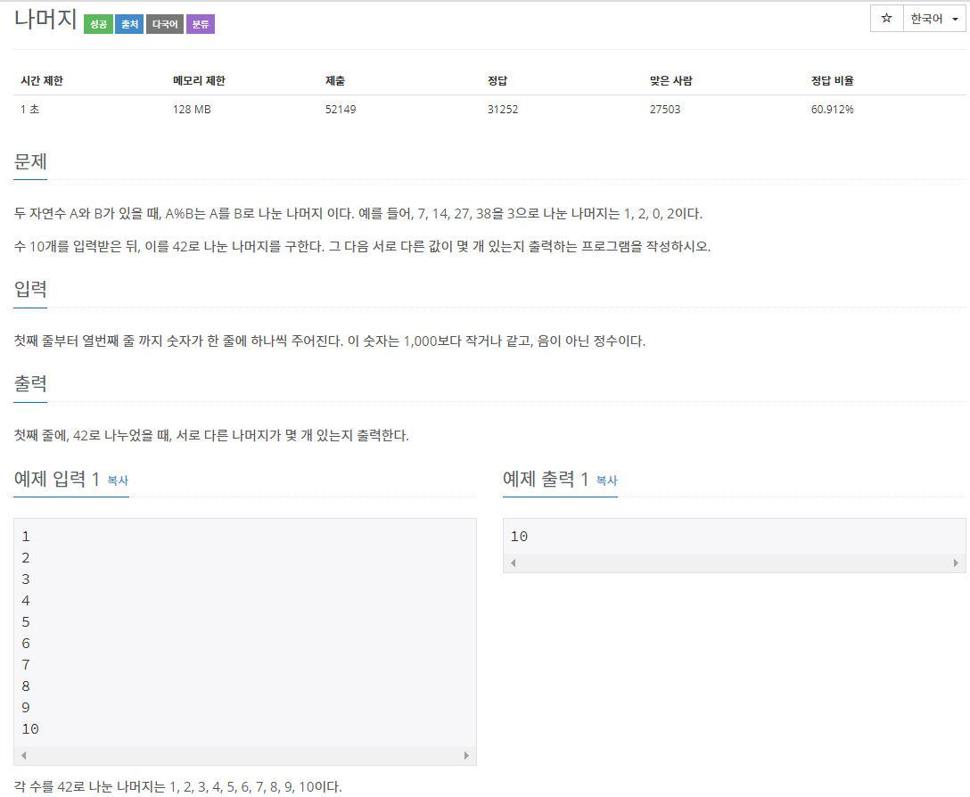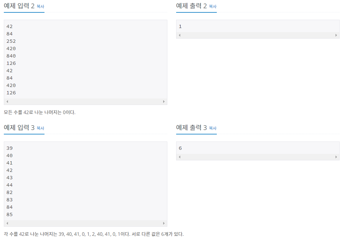 for(int i = 0;i < 10; i++) { // 10개 숫자 입력 받고 42로 나눈다.