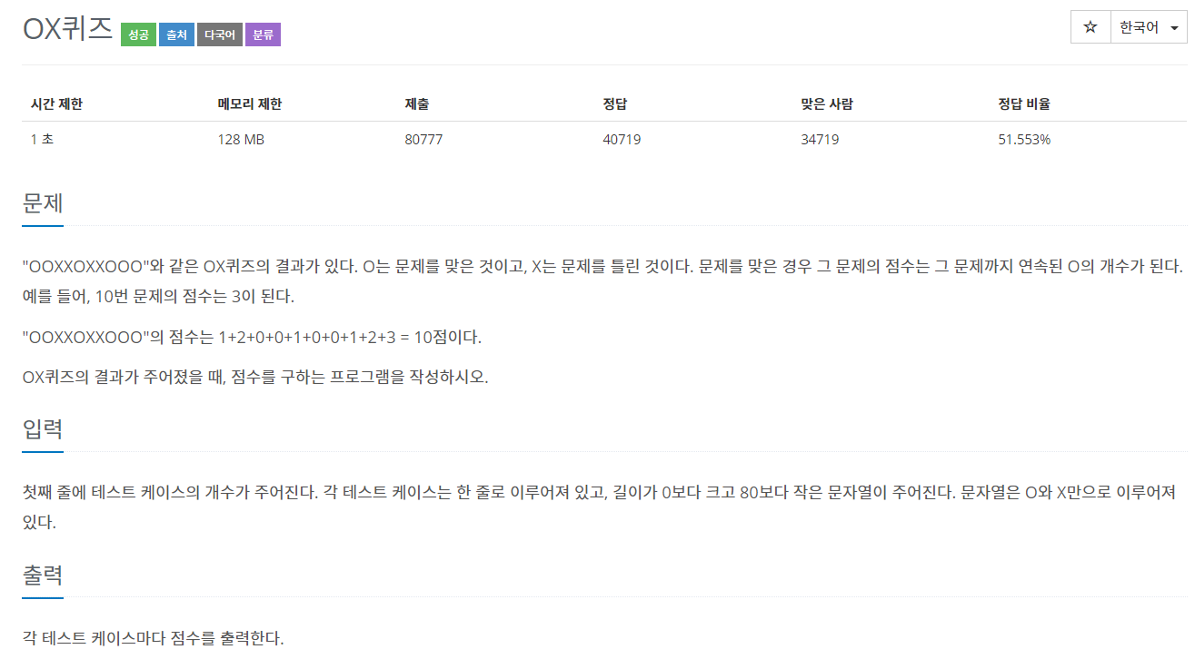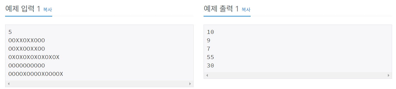 "OOXXOXXOOO"와 같은 OX퀴즈의 결과가 있다. O는 문제를 맞은 것이고, X는 문제를 틀린 것이다. 문제를 맞은 경우 그 문제의 점수는 그 문제까지 연속된 O의 개수가 된다. 예를 들어, 10번 문제의 점수