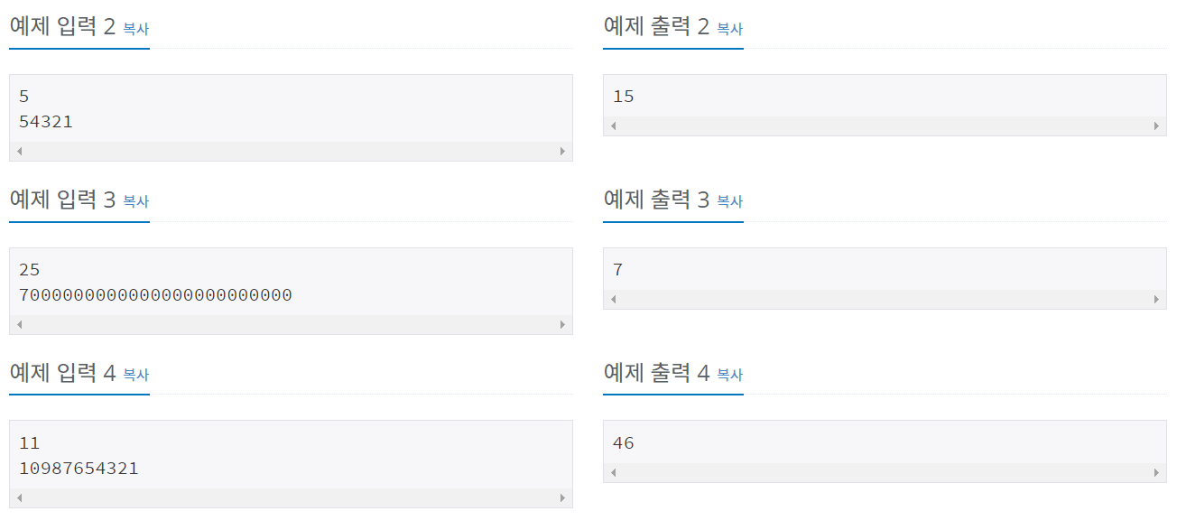 첫째 줄에 숫자의 개수 N (1 ≤ N ≤ 100)이 주어진다. 둘째 줄에 숫자 N개가 공백없이 주어진다.