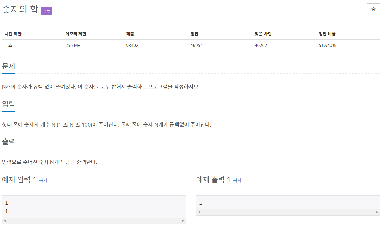 그렇게 받은 char 배열의 각 원소의 값들은 아스키코드 값을 가지고 있기 때문에 -48 또는 -'0' 을 해주어 숫자 값으로 디코딩하고 해당 숫자를 숫자의 개수만큼 for문을 반복하여 그 값을 sum에 더한 후 결과를 출력한다.
