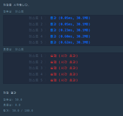 그 결과 보기 좋게 효율성에서 0점을 먹은 결과 화면을 받았다. ( ... )