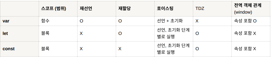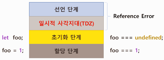 - 일시적 사각지대(Temporal Dead Zone : TDZ) : 스코프의 시작 지점부터 초기화 단계 시작 지점까지 변수를 참조할 수 없는 구간