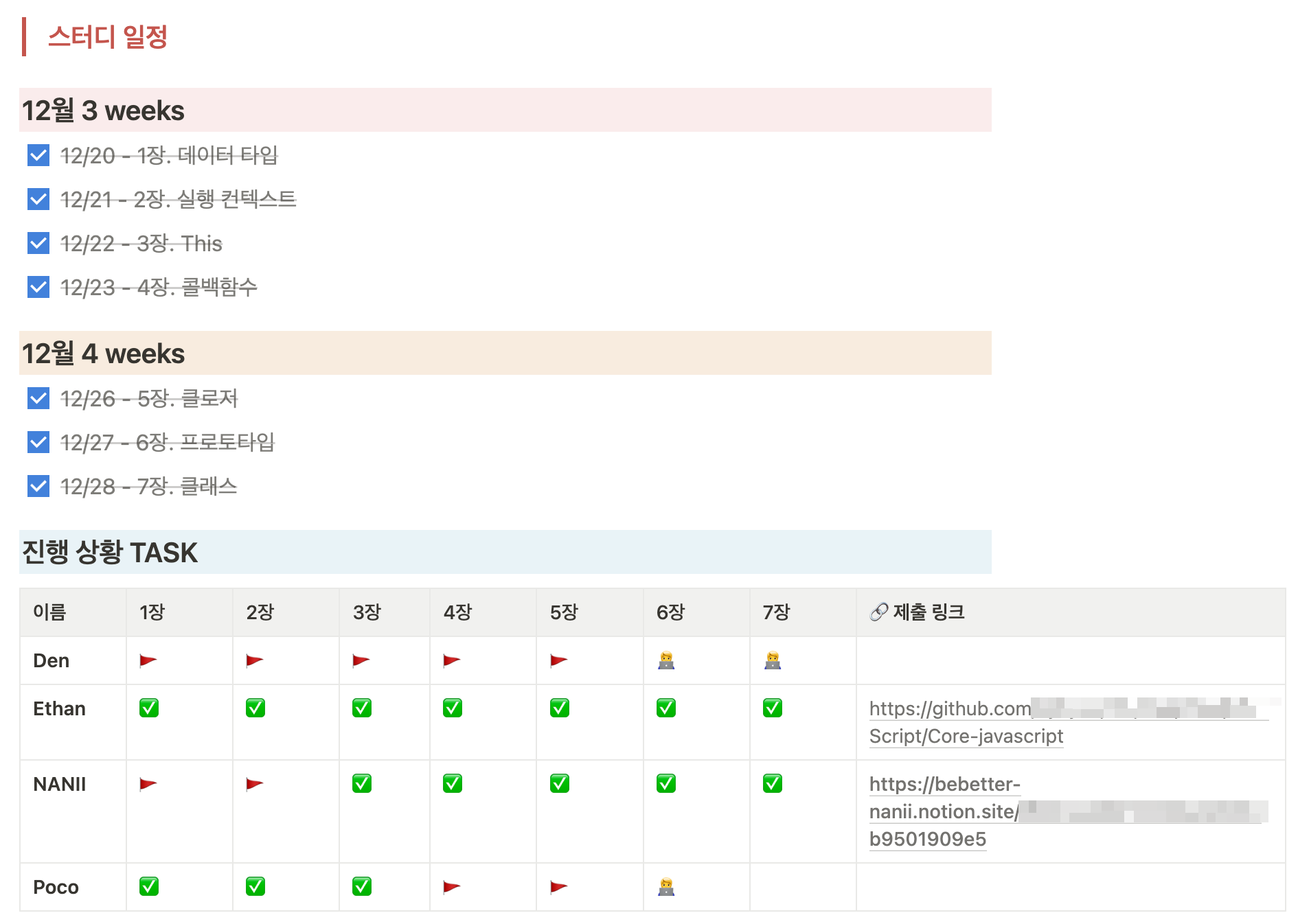 우선 회의를 통해 스터디의 진행 계획에 대해 이야기를 나눴다. 코어 자바스크립트 책의 챕터가 총 7장으로 나뉘어 있어서 하루에 1챕터씩 일주일 동안 각자 같은 챕터를 읽고 Github, 블로그, 노션 등에 정리한 내용을 링크에 남긴 다음 정해진 시간(통상 오후 2시)에 서로 돌아가면서 발표하고 질문하는 방식으로 스터디를 진행하기로 했다. 일주일이라는 기간동안 진행하는 꽤 타이트한 계획이었지만, 서로 같은 상황(모든 시간을 공부에 사용할 수 있는 환경)에 놓이기도 했고 이 당시 본 과정이 10일 남짓 남은 상황이라서 이렇게 계획을 세우게 됐다.
